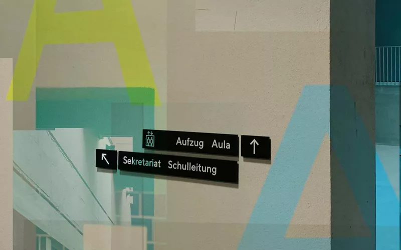Die Gestaltung des Leitsystems ist bewusst einfach und plakativ gehalten, mit neutralen Tafeln im selben dunklen Ton wie die Türen der Schule. Unsichtbare Befestigungen lassen sie leicht und unaufdringlich wirken. Die Wegweiser bilden einen Kontrast zur großen farbigen Nummerierung der Etagen, die als Malerarbeit direkt auf die Wände gebracht wurde. Das durchdachte Leitsystem sorgt für kurze Wege in die Räumlichkeiten und trägt so zu einem modernen Lernumfeld bei.